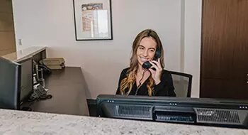 A dedicated receptionist on the phone with a client in Servcorp Santos Place, Brisbane